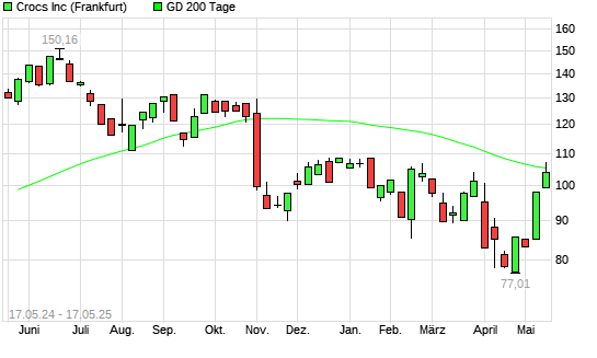 Mit dem Rücksetzer auf 104,12 EUR hat die Crocs-Aktie am 16.05.2025 die 200-Tage-Linie nach unten gekreuzt.