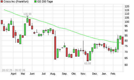 Mit dem Rücksetzer auf 76,61 EUR hat die Crocs-Aktie am 27.02.2026 die 200-Tage-Linie nach unten gekreuzt.