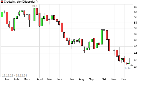 Mit dem Rücksetzer auf 40,48 EUR hat die Croda International-Aktie (ISIN GB00BJFFLV09) am 17.12.2024 ein neues 5-Jahres-Tief erreicht und damit den Kurs vom 06.12.2024 eingestellt.