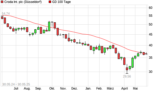 Mit dem Anstieg auf 36,44 EUR hat die Croda International-Aktie am 29.05.2025 die 100-Tage-Linie nach oben gekreuzt.
