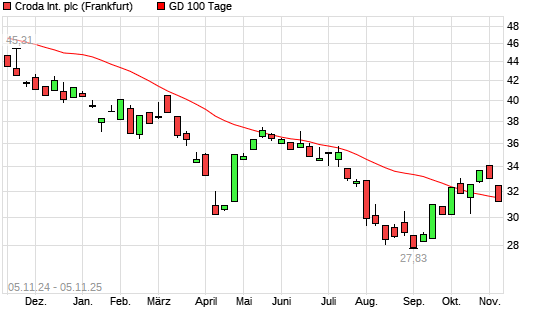 Mit dem Rücksetzer auf 31,43 EUR hat die Croda International-Aktie am 04.11.2025 die 100-Tage-Linie nach unten gekreuzt.