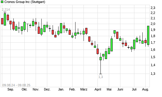 Mit dem Anstieg auf 2,20 EUR hat die Cronos Group-Aktie (ISIN CA22717L1013) am 08.08.2025 ein neues 12-Monats-Hoch erreicht und damit den Kurs vom 16.08.2024 eingestellt.