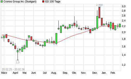 Mit dem Anstieg auf 2,22 EUR hat die Cronos Group-Aktie am 19.02.2026 die 100-Tage-Linie nach oben gekreuzt.