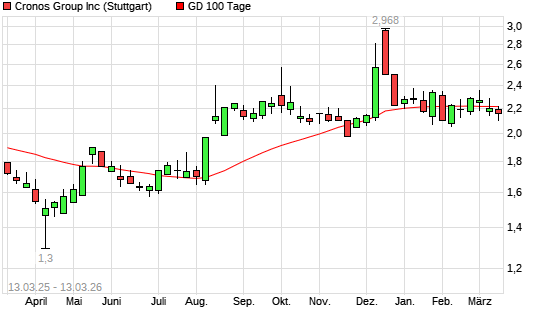 Mit dem Rücksetzer auf 2,17 EUR hat die Cronos Group-Aktie am 12.03.2026 die 100-Tage-Linie nach unten gekreuzt.