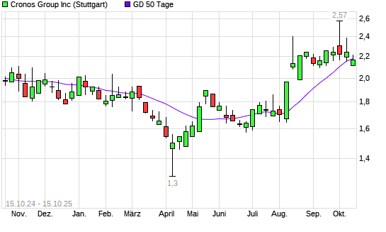 Mit dem Rücksetzer auf 2,16 EUR hat die Cronos Group-Aktie am 14.10.2025 die 50-Tage-Linie nach unten gekreuzt.