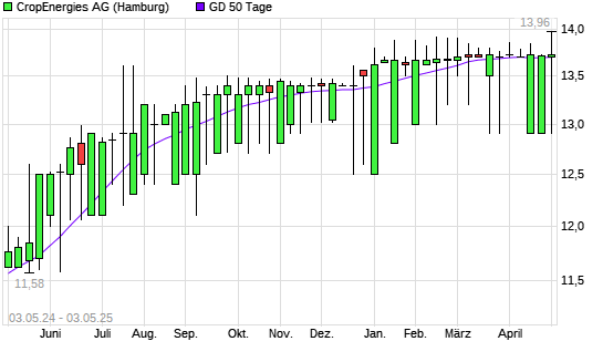 Mit dem Anstieg auf 13,72 EUR hat die CropEnergies-Aktie am 02.05.2025 die 50-Tage-Linie nach oben gekreuzt.