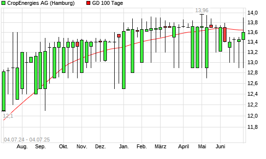 Mit dem Rücksetzer auf 13,59 EUR hat die CropEnergies-Aktie am 03.07.2025 die 100-Tage-Linie nach unten gekreuzt.