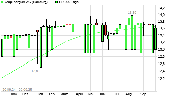 Mit dem Rücksetzer auf 13,61 EUR hat die CropEnergies-Aktie am 29.09.2025 die 200-Tage-Linie nach unten gekreuzt.