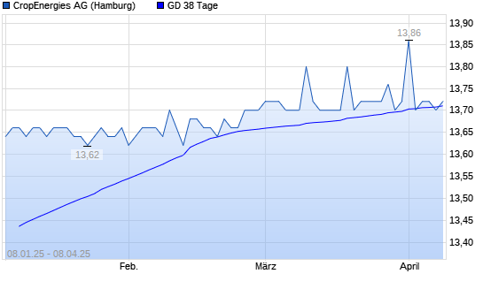 Mit dem Rücksetzer auf 13,70 EUR hat die CropEnergies-Aktie am 07.04.2025 die 38-Tage-Linie nach unten gekreuzt.
