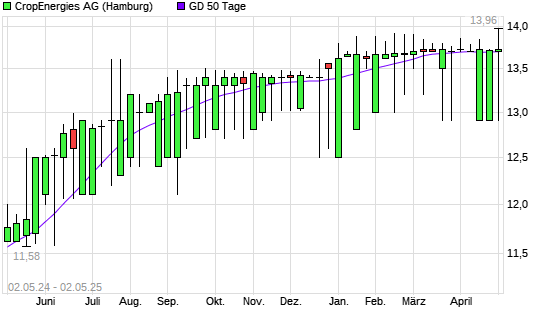 Mit dem Rücksetzer auf 13,70 EUR hat die CropEnergies-Aktie am 01.05.2025 die 50-Tage-Linie nach unten gekreuzt.