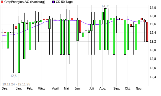 Mit dem Rücksetzer auf 13,65 EUR hat die CropEnergies-Aktie am 18.11.2025 die 50-Tage-Linie nach unten gekreuzt.
