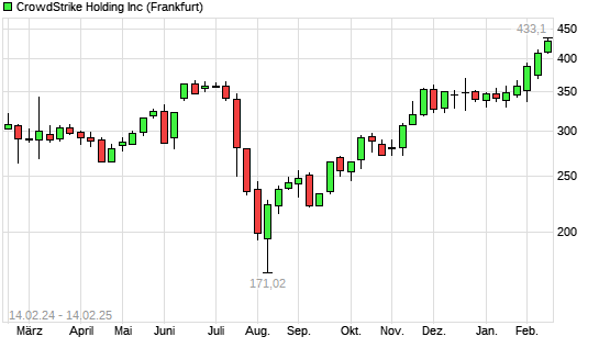 Mit dem Anstieg auf 430,75 EUR hat die CrowdStrike-Aktie (ISIN US22788C1053) am 13.02.2025 ein neues All-Time-High erreicht und damit den Kurs vom 12.02.2025 eingestellt.