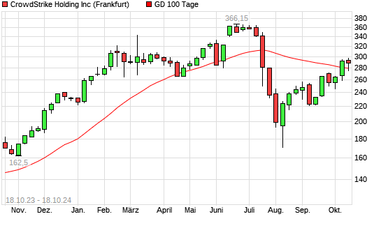 Mit dem Anstieg auf 281,70 EUR hat die CrowdStrike-Aktie am 17.10.2024 die 100-Tage-Linie nach oben gekreuzt.