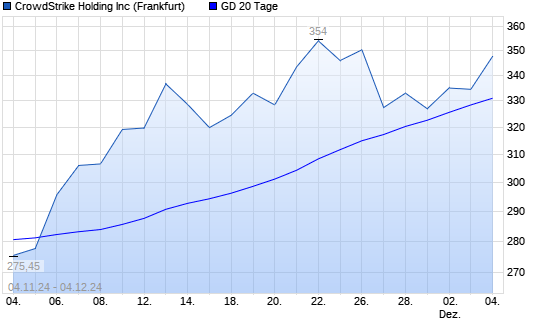 Mit dem Anstieg auf 328,70 EUR hat die CrowdStrike-Aktie am 03.12.2024 die 20-Tage-Linie nach oben gekreuzt.