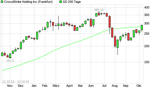 Mit dem Anstieg auf 288,00 EUR hat die CrowdStrike-Aktie am 11.10.2024 die 200-Tage-Linie nach oben gekreuzt.