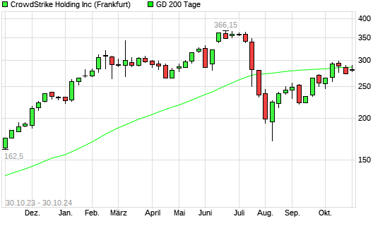 Mit dem Anstieg auf 287,50 EUR hat die CrowdStrike-Aktie am 29.10.2024 die 200-Tage-Linie nach oben gekreuzt.