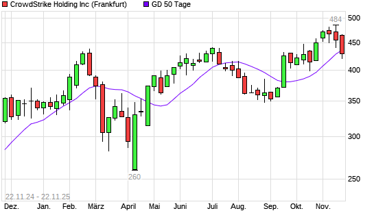 Mit dem Rücksetzer auf 435,55 EUR hat die CrowdStrike-Aktie am 21.11.2025 die 50-Tage-Linie nach unten gekreuzt.