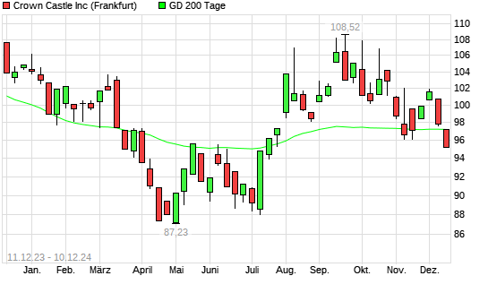 Mit dem Rücksetzer auf 97,08 EUR hat die Crown Castle International-Aktie am 09.12.2024 die 200-Tage-Linie nach unten gekreuzt.