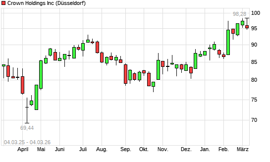 Mit dem Anstieg auf 98,68 EUR hat die Crown Holdings-Aktie (ISIN US2283681060) am 03.03.2026 ein neues 3-Jahres-Hoch erreicht und damit den Kurs vom 25.02.2026 eingestellt.