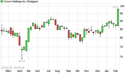Mit dem Anstieg auf 90,84 EUR hat die Crown Holdings-Aktie (ISIN US2283681060) am 03.02.2026 ein neues 6-Monats-Hoch erreicht und damit den Kurs vom 13.01.2026 eingestellt.
