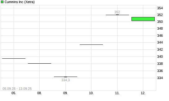 Mit dem Anstieg auf 349,00 EUR hat die Cummins-Aktie (ISIN US2310211063) am 12.09.2025 ein neues 6-Monats-Hoch erreicht und damit den Kurs vom 25.08.2025 eingestellt.