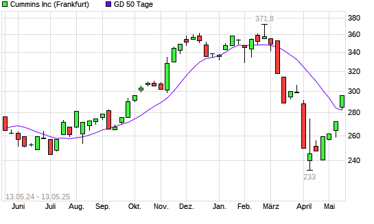 Mit dem Anstieg auf 290,80 EUR hat die Cummins-Aktie am 12.05.2025 die 50-Tage-Linie nach oben gekreuzt.