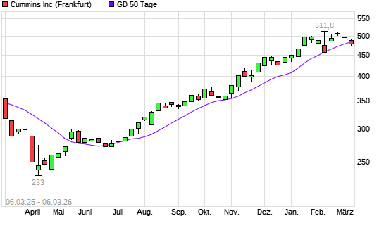 Mit dem Anstieg auf 491,50 EUR hat die Cummins-Aktie am 05.03.2026 die 50-Tage-Linie nach oben gekreuzt.