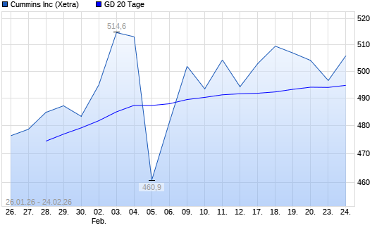 Mit dem Rücksetzer auf 492,80 EUR hat die Cummins-Aktie am 23.02.2026 die 20-Tage-Linie nach unten gekreuzt.