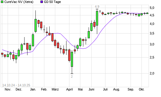 Mit dem Anstieg auf 4,64 EUR hat die CureVac-Aktie am 13.10.2025 die 50-Tage-Linie nach oben gekreuzt.