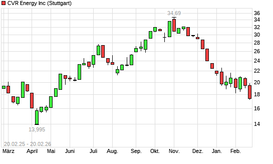 Mit dem Rücksetzer auf 18,04 EUR hat die Cvr Energy-Aktie (ISIN US12662P1084) am 19.02.2026 ein neues 6-Monats-Tief erreicht und damit den Kurs vom 28.01.2026 eingestellt.