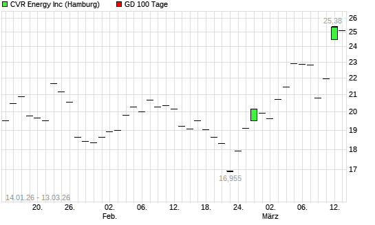 Mit dem Anstieg auf 24,78 EUR hat die Cvr Energy-Aktie am 12.03.2026 die 100-Tage-Linie nach oben gekreuzt.