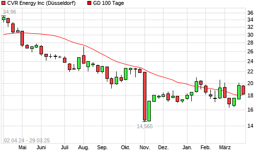 Mit dem Rücksetzer auf 18,01 EUR hat die Cvr Energy-Aktie am 28.03.2025 die 100-Tage-Linie nach unten gekreuzt.