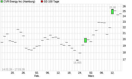 Mit dem Rücksetzer auf 23,96 EUR hat die Cvr Energy-Aktie am 16.03.2026 die 100-Tage-Linie nach unten gekreuzt.