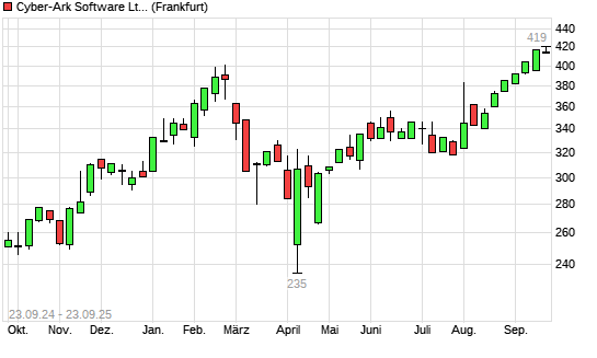 Mit dem Anstieg auf 419,00 EUR hat die CyberArk Software-Aktie (ISIN IL0011334468) am 22.09.2025 ein neues All-Time-High erreicht und damit den Kurs vom 19.09.2025 eingestellt.