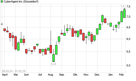 Mit dem Anstieg auf 7,40 EUR hat die Cyberagent-Aktie (ISIN JP3311400000) am 06.02.2025 ein neues 12-Monats-Hoch erreicht und damit den Kurs vom 30.01.2025 eingestellt.
