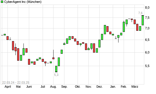 Mit dem Anstieg auf 7,60 EUR hat die Cyberagent-Aktie (ISIN JP3311400000) am 21.03.2025 ein neues 12-Monats-Hoch erreicht und damit den Kurs vom 10.02.2025 eingestellt.