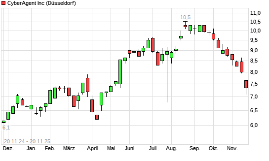 Mit dem Rücksetzer auf 7,40 EUR hat die Cyberagent-Aktie (ISIN JP3311400000) am 19.11.2025 ein neues 6-Monats-Tief erreicht und damit den Kurs vom 18.11.2025 eingestellt.