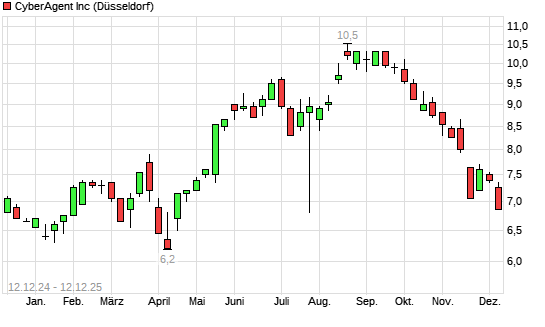 Mit dem Rücksetzer auf 7,00 EUR hat die Cyberagent-Aktie (ISIN JP3311400000) am 11.12.2025 ein neues 6-Monats-Tief erreicht und damit den Kurs vom 10.12.2025 eingestellt.