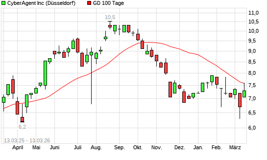 Mit dem Rücksetzer auf 7,50 EUR hat die Cyberagent-Aktie am 12.03.2026 die 100-Tage-Linie nach unten gekreuzt.