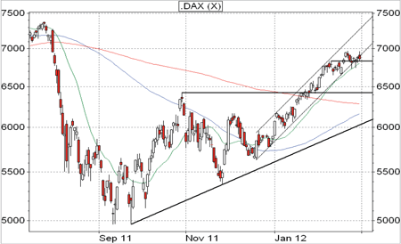 Rosenheim (DAX-Premium-Trader) - Der DAX ist nach Gewinnen von 9% im Januar sowie einer Performance von 6% im Februar zum Monatsende knapp unterhalb des Jahreshochs bei 6.971 Punkten vorläufig außer Atem gekommen. Da ein neues Erholungs-Top bislang ausgeblieben ist, trübt sich das charttechnische Bild unter Berücksichtigung der Trenddefinition nun etwas ein. Sofern das deutsche Leitbarometer jetzt auch die Serie der ansteigenden Tiefpunkte durchbricht, könnte eine mehrwöchige Korrektur ins Laufen kommen. Dieses Szenario würde uns perfekt in die Karten spielen und auf einem deutlich niedrigeren Kursniveau noch einmal lukrative Einstiegsgelegenheiten eröffnen. Konkret: