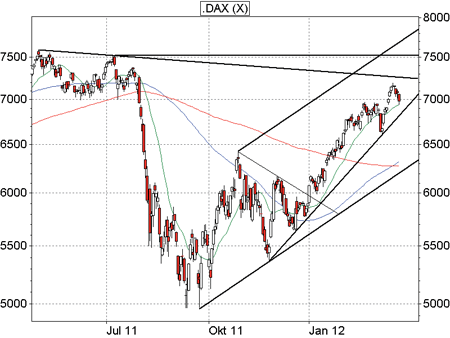 Mit Spitzennotierungen bei 7.194 Punkten ist der DAX kurz vor dem Erreichen wichtiger charttechnischer Zwischenzielzonen wieder nach unten gedreht. Diese lassen sich vor allem aus dem Dezember-Dreiecks-Muster und der Mai-Abwärtstrendgeraden ableiten und sind derzeit auf dem Niveau von 7.200/7.230 zu finden. Gelingt dort ein Break, könnte anschließend sogar die obere Begrenzung des September-Aufwärtstrendkanals bei 7.500 in Schlagdistanz rücken. Diese Region dürfte nachhaltig im ersten Anlauf allerdings kaum zu halten sein, zumal selbst im bullischen Szenario anschließend ein Pullback auf den Ausbruchsbereich von 7.200 Punkten zu favorisieren wäre. Bevor jedoch erneut 7.200 Zähler in Angriff genommen werden, bleibt der DAX unterhalb von 7.000 Punkten anfällig für eine Korrektur. Idealerweise wird dabei in den kommenden Sitzungen erfolgreich die bedeutende November-Aufwärtstrendgerade zwischen 6.830 und 6.850 Punkten auf den Prüfstand gestellt.