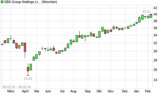 Mit dem Anstieg auf 40,21 EUR hat die DBS Group-Aktie (ISIN SG1L01001701) am 05.02.2026 ein neues All-Time-High erreicht und damit den Kurs vom 16.01.2026 eingestellt.