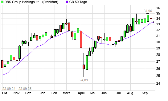Die DBS Group-Aktie befindet sich seit dem 07.07.2025 im langfristigen Aufwärtstrend und hat in diesem Zeitraum +10,40% an Wert gewonnen. Der Abstand zur 200-Tage-Linie beträgt aktuell +6,22%.