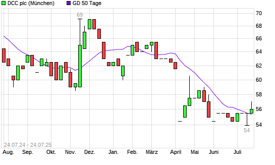 Mit dem Rücksetzer auf 54,50 EUR hat die DCC-Aktie am 23.07.2025 die 50-Tage-Linie nach unten gekreuzt.