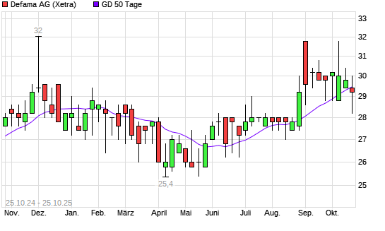 Mit dem Rücksetzer auf 29,00 EUR hat die DEFAMA-Aktie am 24.10.2025 die 50-Tage-Linie nach unten gekreuzt.
