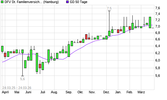Mit dem Rücksetzer auf 6,95 EUR hat die DFV Deutsche Familienversicherung-Aktie am 23.03.2026 die 50-Tage-Linie nach unten gekreuzt.
