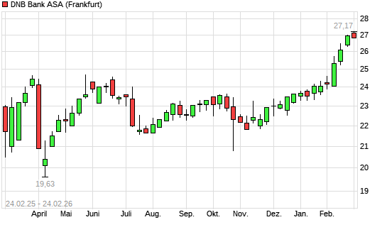 Mit dem Anstieg auf 27,09 EUR hat die DNB Bank ASA-Aktie (ISIN NO0010161896) am 23.02.2026 ein neues All-Time-High erreicht und damit den Kurs vom 20.02.2026 eingestellt.