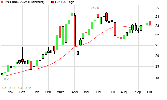 Mit dem Rücksetzer auf 22,93 EUR hat die DNB Bank ASA-Aktie am 07.10.2025 die 100-Tage-Linie nach unten gekreuzt.