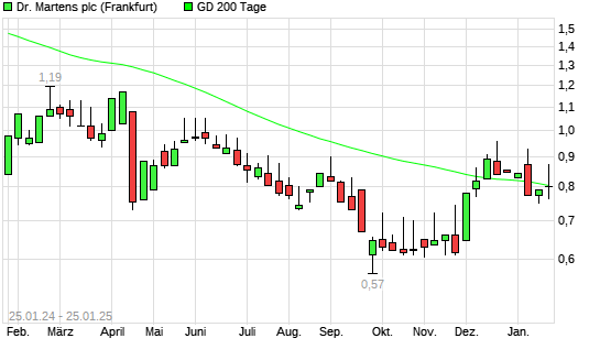 Mit dem Rücksetzer auf 0,80 EUR hat die DR. MARTENS-Aktie am 24.01.2025 die 200-Tage-Linie nach unten gekreuzt.