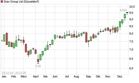 Mit dem Anstieg auf 9,46 EUR hat die DRAX GROUP-Aktie (ISIN GB00B1VNSX38) am 22.12.2025 ein neues 3-Jahres-Hoch erreicht und damit den Kurs vom 19.12.2025 eingestellt.